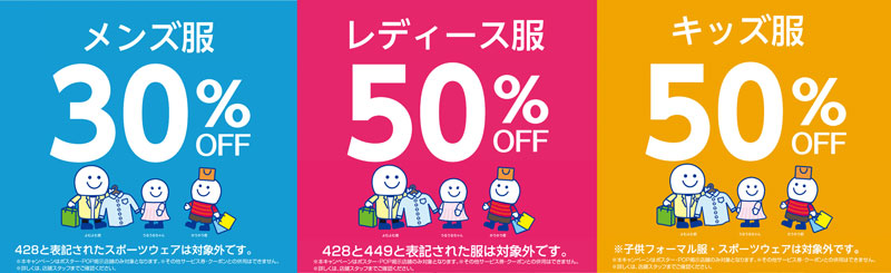 メンズ服30%OFF、レディース・キッズ服50%OFF
