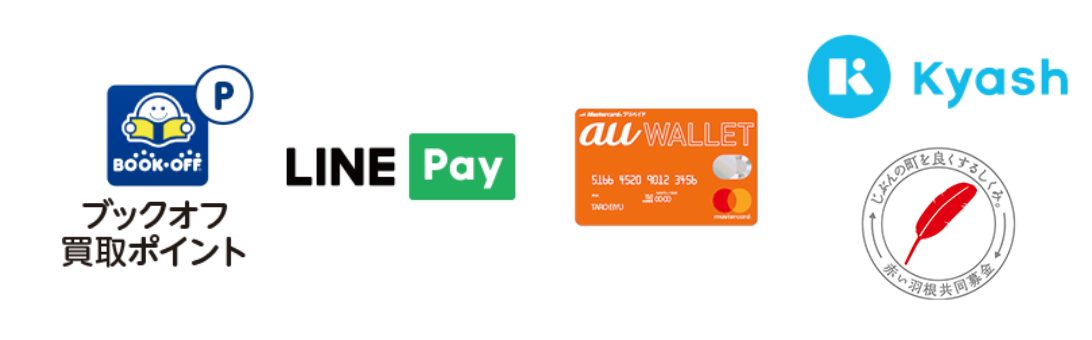 受け取りはブックオフ買取ポイント、LINEpay、auWALLET、Kyash、赤い羽根共同募金などが可能。