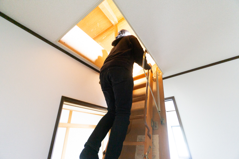 天井からこのようにハシゴが出てきて上に登ることが可能。