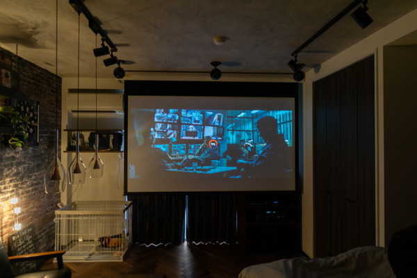 うわ!これもうホームシアターって憧れの的じゃないですか。しかも電動のスクリーン!これ何インチですか?