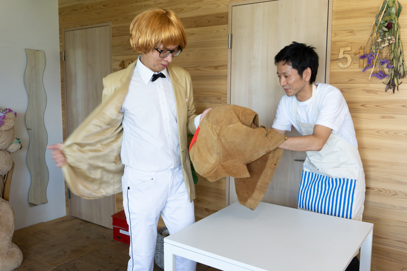 「そうそうそうそう、これ着てな、コレ持ってな・・・」