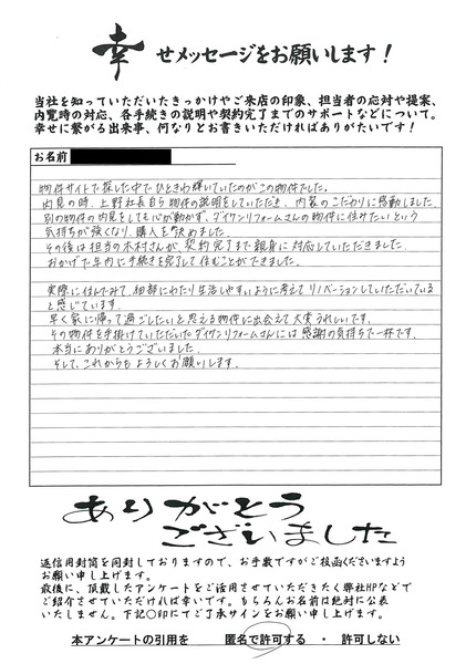 「これは毎回お客様にご協力いただいてるアンケートなんやけど、弊社のリノベーション済み物件を購入いただいたN様からもらった実際のお声なんです」