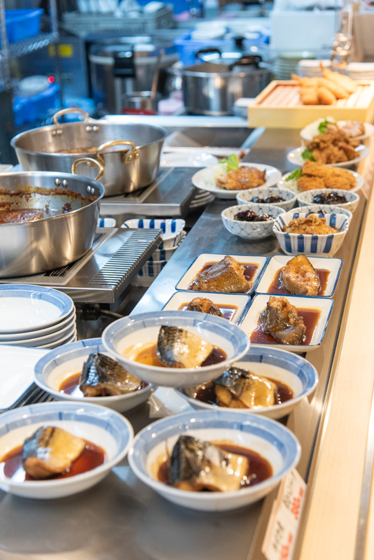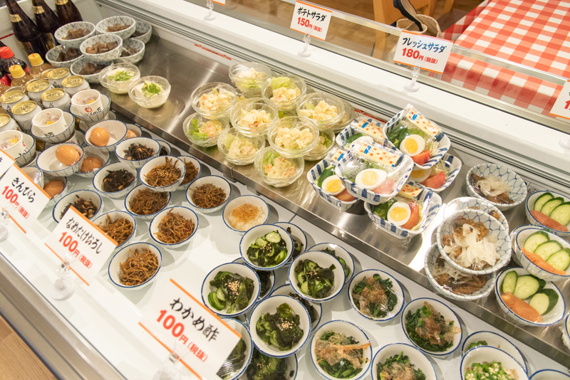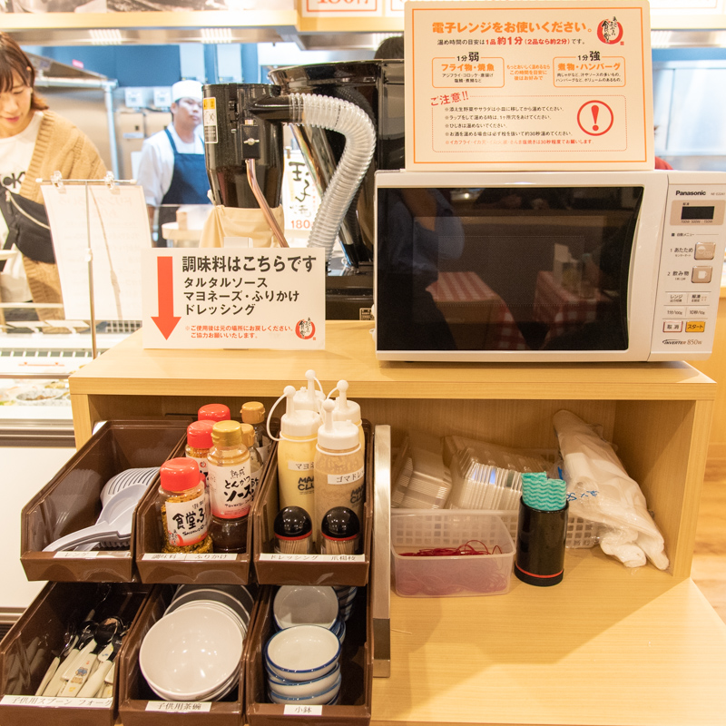 学生時代の食堂を思い出します。レンジやソース・ドレッシングなどもあるのでお好みでかけたり、温めたりできます。