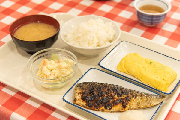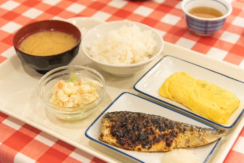 鯖の塩焼き(324円)・卵焼(ネギ入り 388円)・ポテトサラダ(162円)・ご飯(172円)・みそ汁(86円)