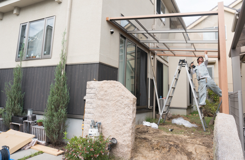 植栽や敷いていた芝をとった後は、いよいよ大きな屋根付きのテラスの設置に取り掛かります。