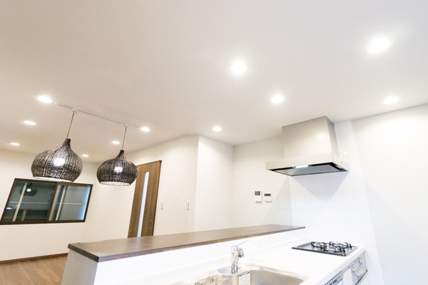 天井もカッコいいやろ?高さを加えて、さらにダウンライトにしてるから広さも感じてもらえると思うで。