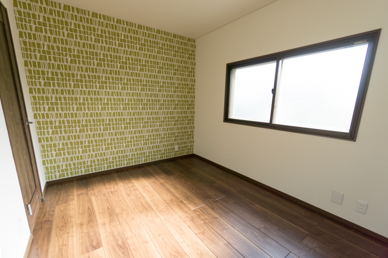 壁の一面だけアクセントクロスを取り入れてるんよ。