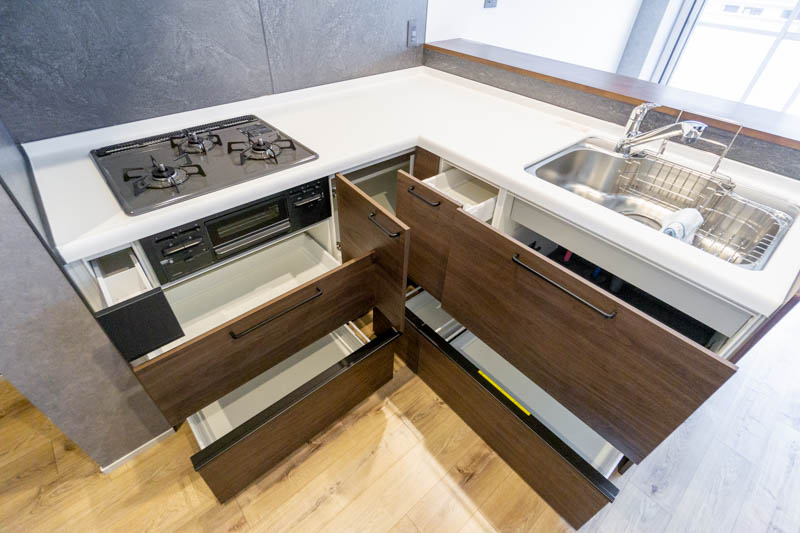 「キッチンがL字型で3つ口のガスコンロや![]()