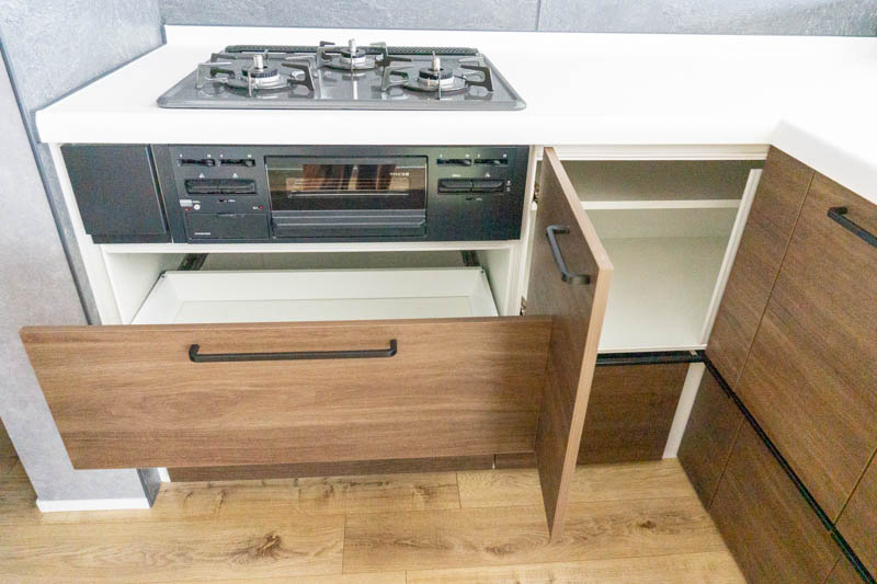 棚板の高さも変えられるし、コンロのすぐ横にこんなに食品ストック置けるってめっちゃ便利やわ〜」