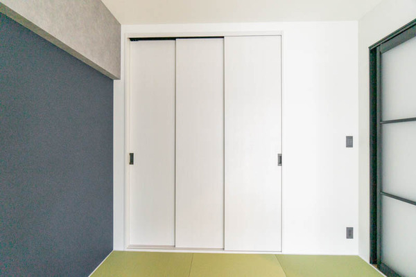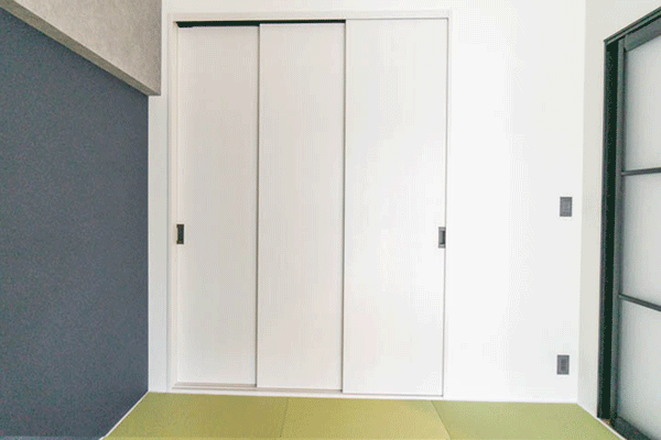 和紙っぽい模様が部屋に合っていて、クールな色合いが建具との相性◎