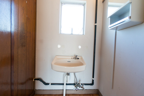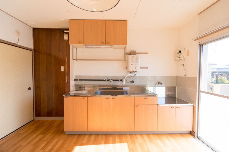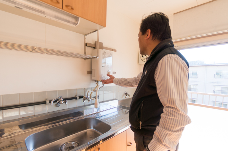 キッチン自体は、前に住んでいらっしゃった方が比較的最近に取替えられていたみたいなので、そのまま使用しました。給湯器とプロペラ式の換気扇は古いものなので…