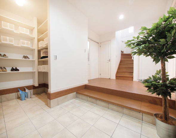 と、玄関の段差を利用した収納へ背の高いブーツをすっぽり収納!