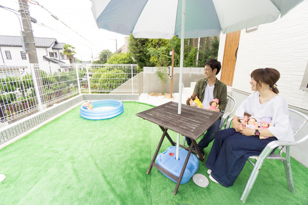子どもたちをビニールプールに入れてあげられたり、小さな子どもが充分遊べるプライベートガーデンは、敷地面積が43.62坪もある広さならでは!!