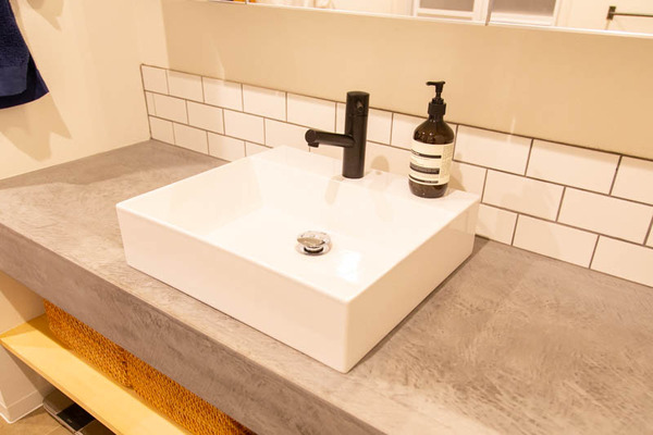 「キッチンの台は「モールテックス」という薄くてもコンクリート以上の強度がある素材で出来てて、水とか汚れに強い作業台を作ってもらいました!
