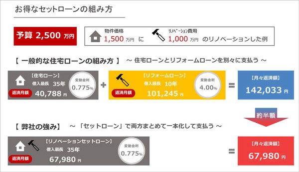 しかし、住宅とリフォームを合わせたセットローンを利用すると、月々の返済は6万7000円ほどで金利も低く、比べると約半額になります。
