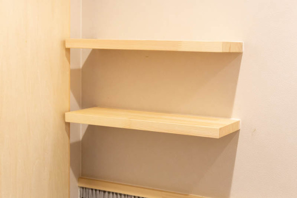 「ここの洗面の棚も、施主さまの希望で棚受けの金具を見せたくないということやったんで、棚自体を壁に埋め込んでるんですよ。」