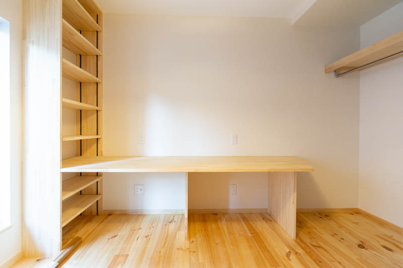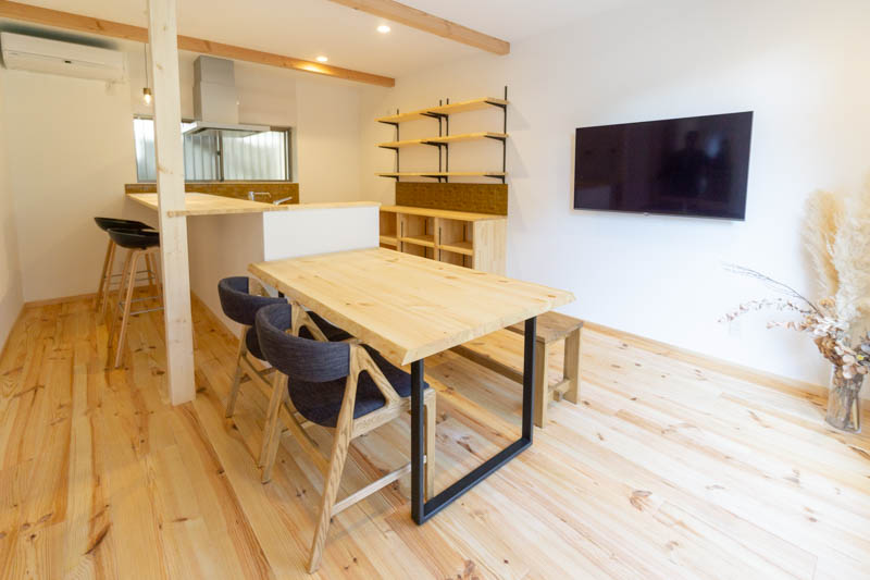フローリングはもちろん、柱や梁、棚やテーブルまで全て無垢の木材が使用されています。