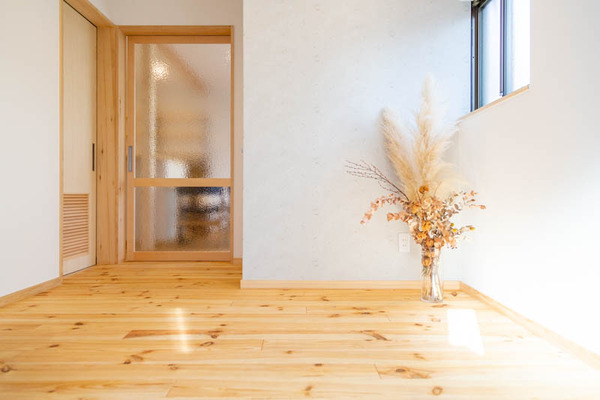 リビングもボルドーパインのフローリングで、外からの光と相まって温かみのある印象。