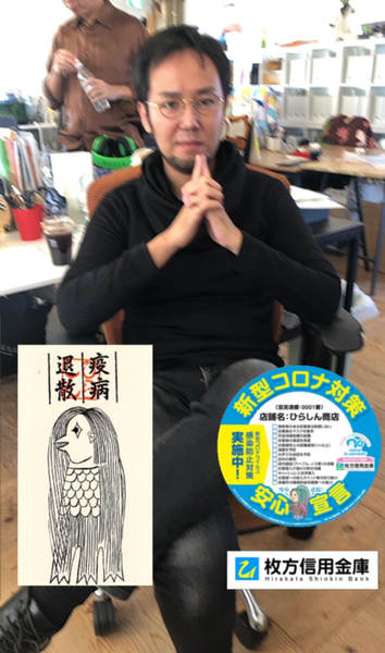(アマビエの画像がランダムで登場。写っているのははらだ@ひらつー。撮る時手ブレがひどく、ぶれました)