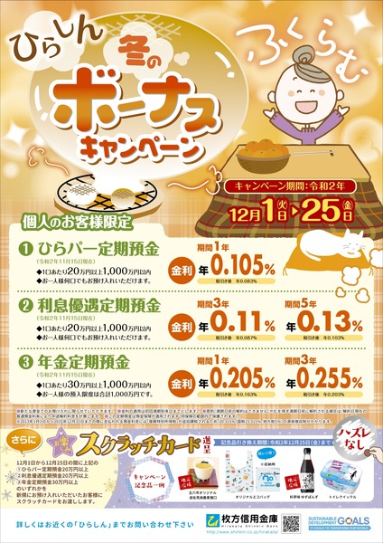 枚方信用金庫では、新規で個人の定期預金をお預けいただいた方を対象に12/1(火)〜12/25(金)までの期間で冬のボーナスキャンペーンを開催!定期預金を検討している方は要チェックじゃ!」