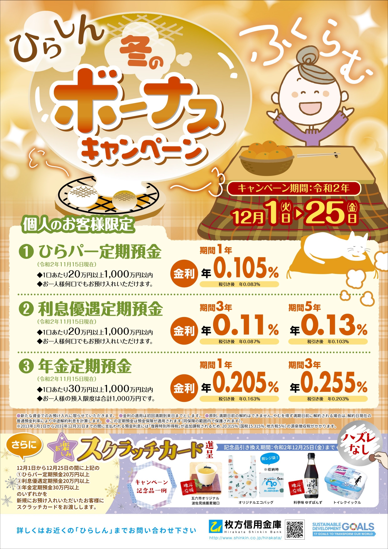 「12/25(金)までに個人のお客様限定でキャンペーン対象定期預金をお預け頂くと、 スクラッチカードをプレゼント!ハズレなしで必ず記念品をプレゼントしておるぞ!