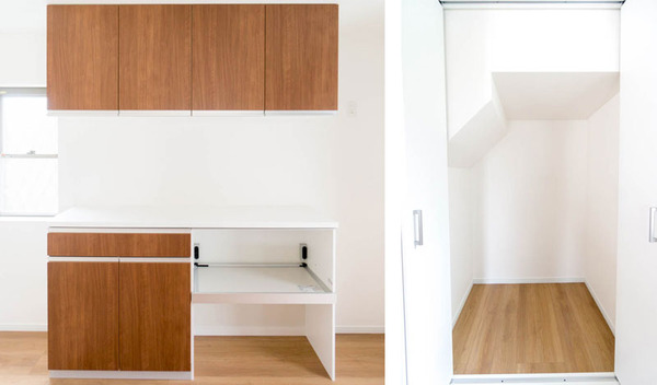 キッチン後ろ側には備え付けの収納、そしてパントリーも設置されています。
