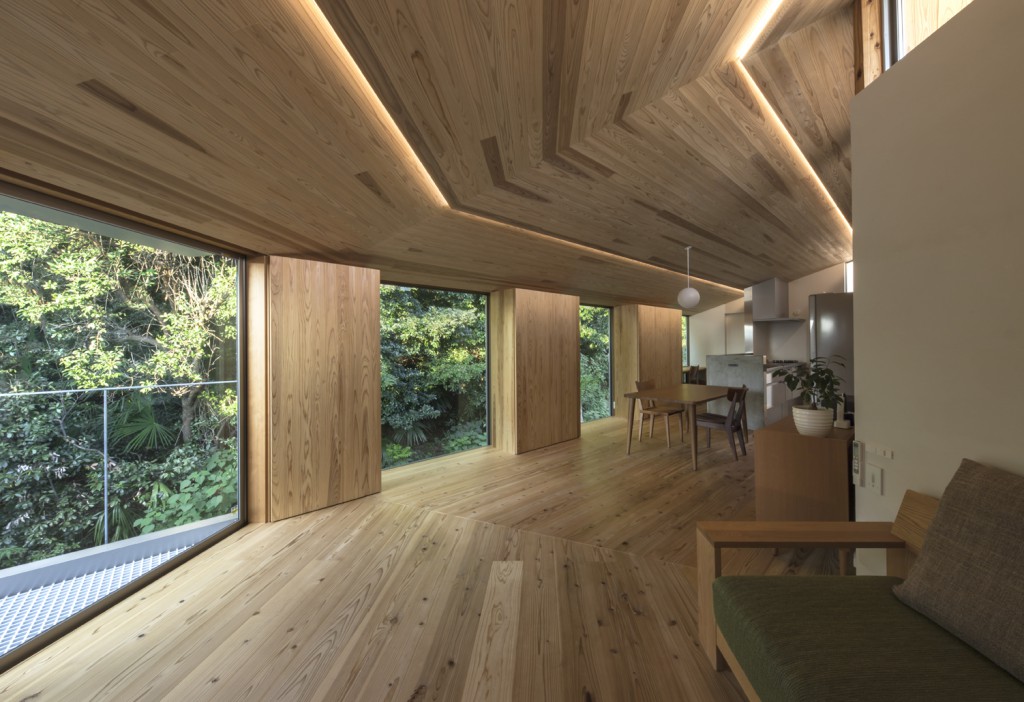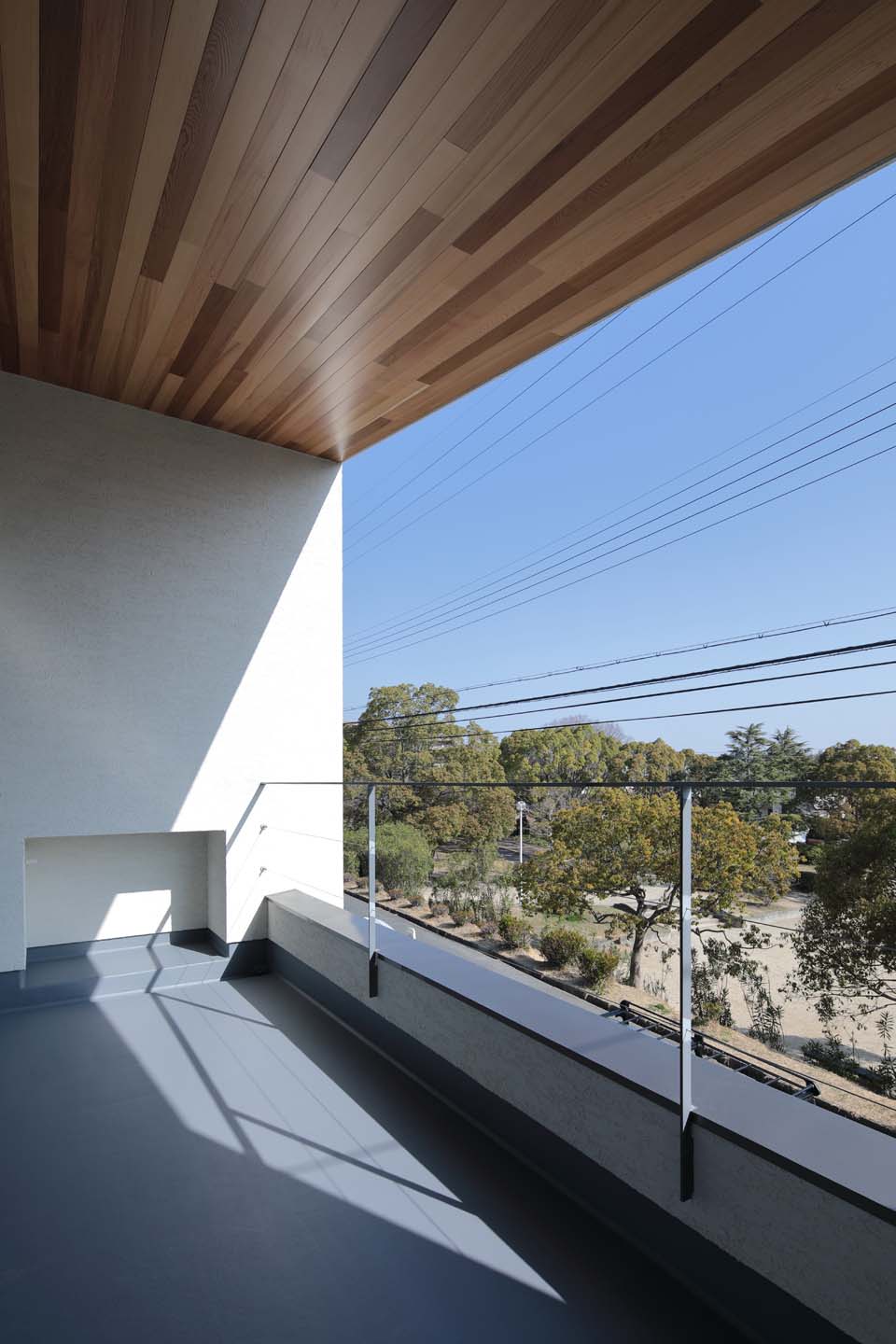 車を格納できるガレージの上の空間を利用し、公園を臨める一番いい場所に大開口とリビングスペースを設けました。