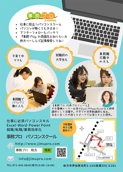 自身の講師経験を生かし、PC作業時間を徹底的に効率化できる講座をフレキシブルな形で提供する「事務プロ」を2015年よりスタート。枚方市から創業のサポートを受け、輝きプラザきららのインキュベートルームで教室をはじめ、現在は枚方公園に拠点を移しさらにパワーアップ!