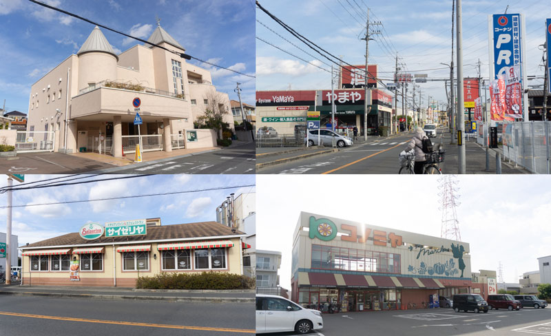 小学校・保育園・病院が近いのはもちろん、コノミヤ・関西スーパーなどのスーパーやコーナンPRO、サイゼリヤや大阪王将などの飲食店、さらにバースデーやしまむらまでなんでも揃っている通りに自転車・車で5分ほどででられます。