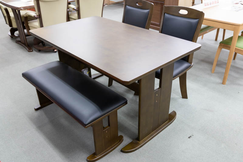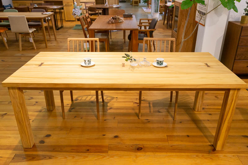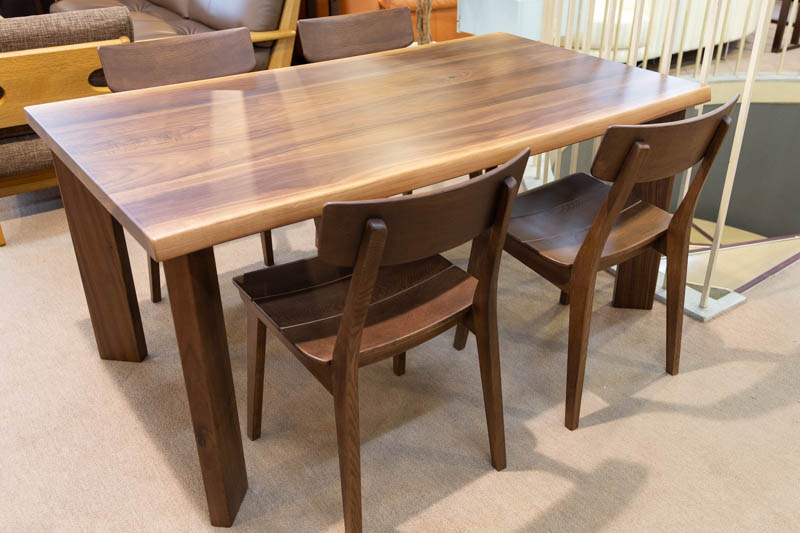 深みのあるブラウンと流れるような木目が美しいダイニングセット。