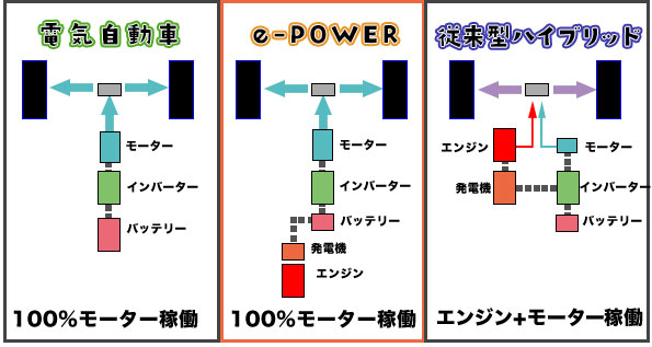 100%電気だけで動くクルマ。その都度、充電する必要がある。 【e-POWER】