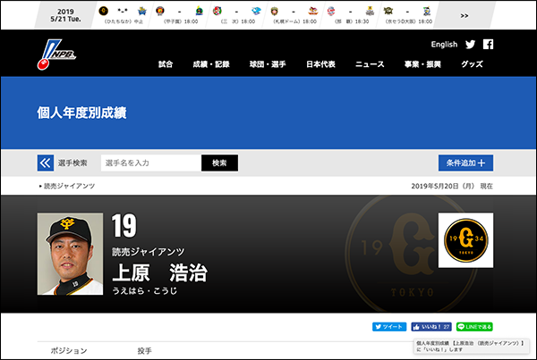 上原 浩治(読売ジャイアンツ) | 個人年度別成績 | NPB.jp 日本野球機構