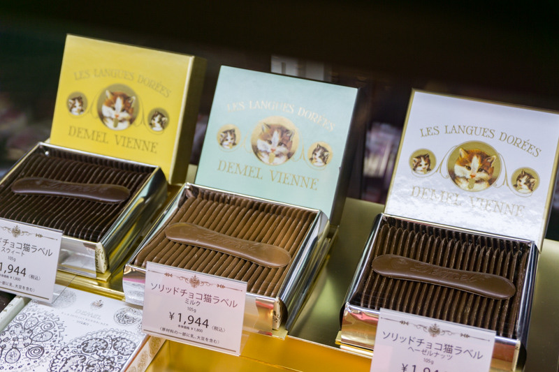 こちらのネコの舌をイメージしたソリッドチョコは、DEMELの定番商品。箱に描かれたネコちゃんもかわいい♪3種類あります。
