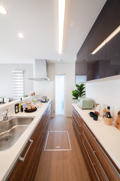 キッチンからもお庭全体が見えるので、ウッドデッキで子どもが遊んでいるのを見ることもできます。