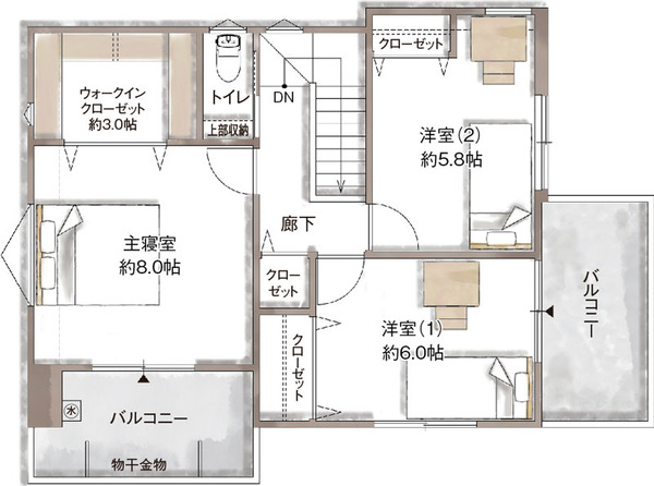 主寝室、洋室が2部屋あり、バルコニーも2つあります。