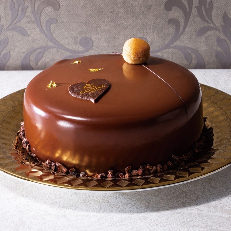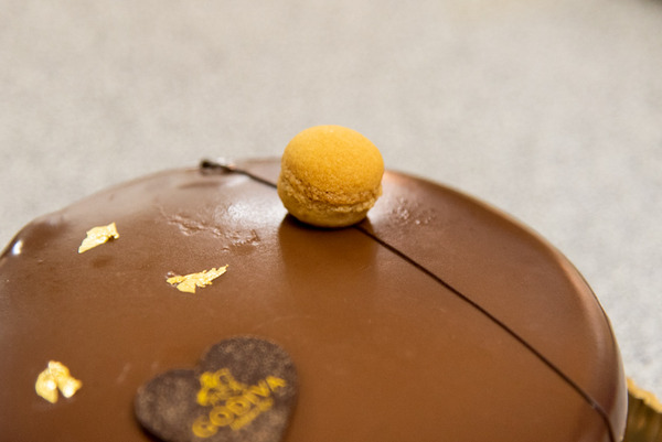 中は白ごまペースト入りチョコレートグレース・ダークチョコレートムース・ビスキュイ・マロングラッセ・バニラクリーム・カカオニブが絶妙に重なり合っています。ハートのロゴチョコレート・マカロン・チョコレートのラインデコレーションが上に施されています。
