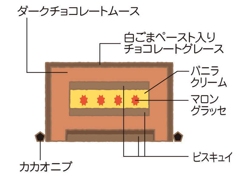 チョコレートムース、ビスキュイ、そして中央にはマロングラッセが入ったバニラクリームの3つの層。なめらかでコクのある味わいが風味豊かに広がります。