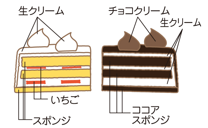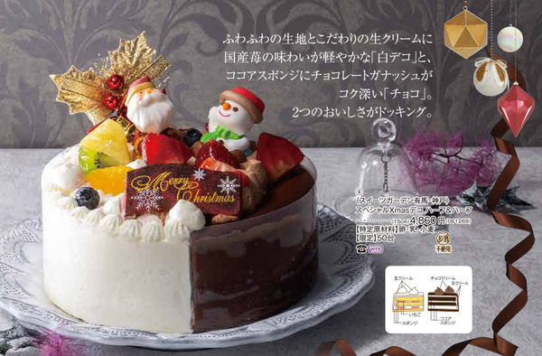 ふわふわ生地とこだわり生クリームに、いちごの「白デコ」とコク深い「チョコ」。2つの味が楽しめます。