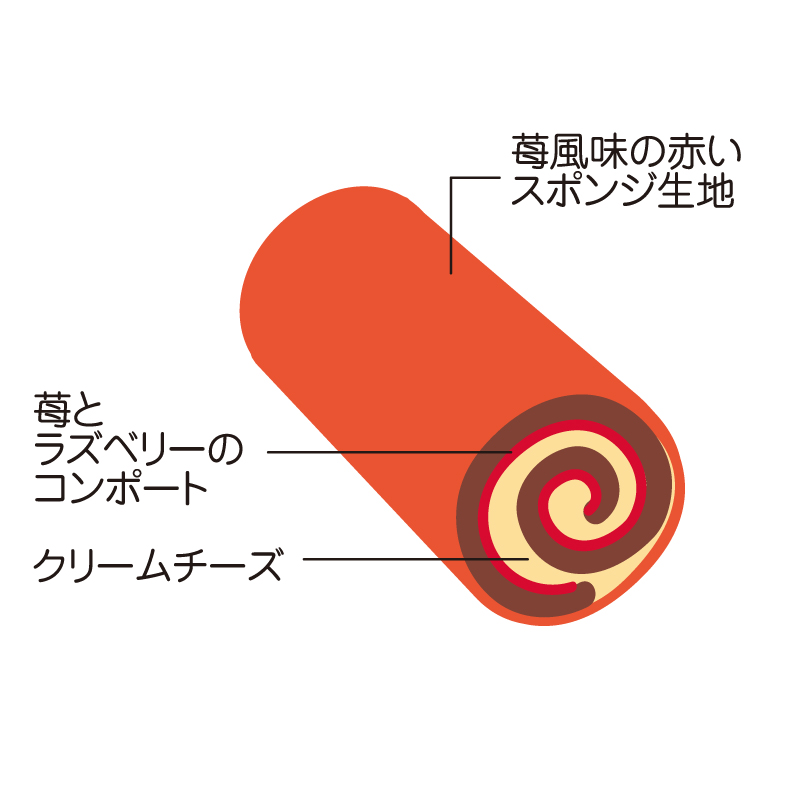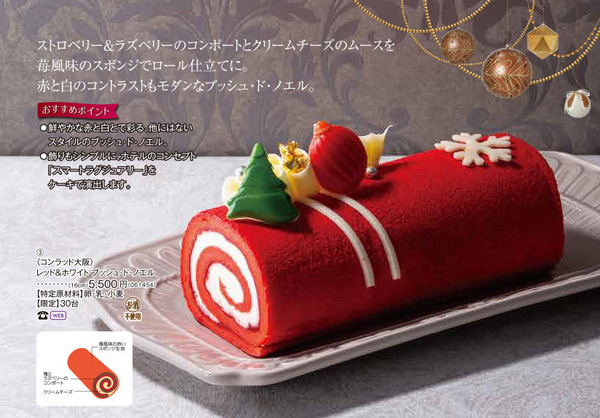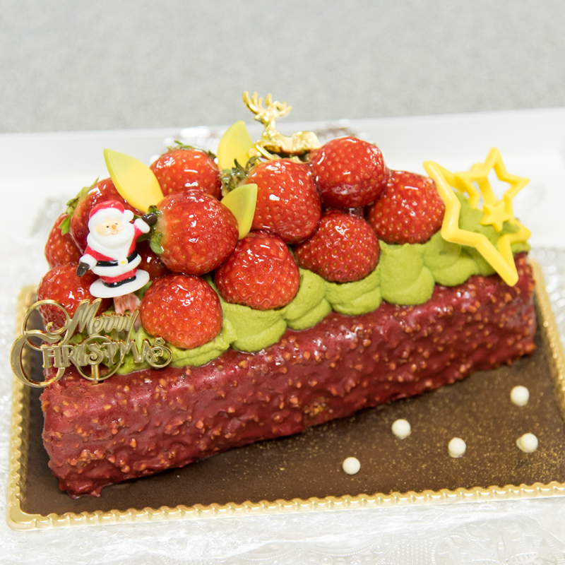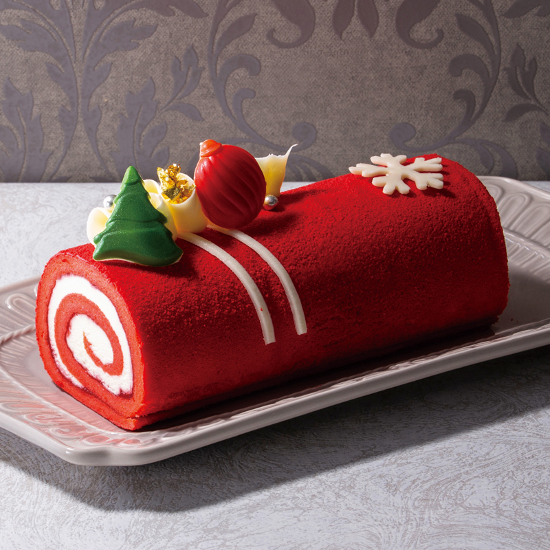 赤いスポンジ生地・ストロベリーとラズベリーのコンポート・クリームチーズのムースの3層で構成し、それをロール仕立てとしたブッシュ・ド・ノエルでコンテンポラリーなクリスマスを演出します。