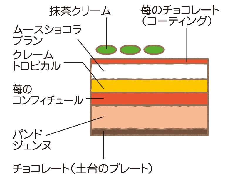 上から、ムースショコラブラン・クレームトロピカル・苺のコンフィチュール・パン ド ジェンヌの4つの層に分かれています。それぞれのマリアージュが楽しめます!