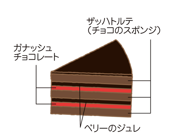 ラズベリー、苺、カシスのベリージュレの甘酸っぱさが、香り高く濃厚なチョコレートスポンジとクリームの心地よいアクセントに!