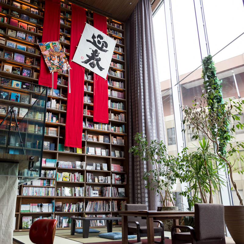 もうすぐお正月ということで、壁一面の本棚にはお正月飾りもお目見え。