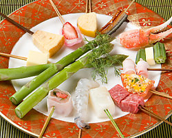 ・ノルウェーサーモンのタルタル乗せ・蓮根ミンチ詰め・豚ヒレ肉・海老のしそ巻き・アスパラ肉巻き・ペティオニオン・季節の創作串・カマンベールチーズ