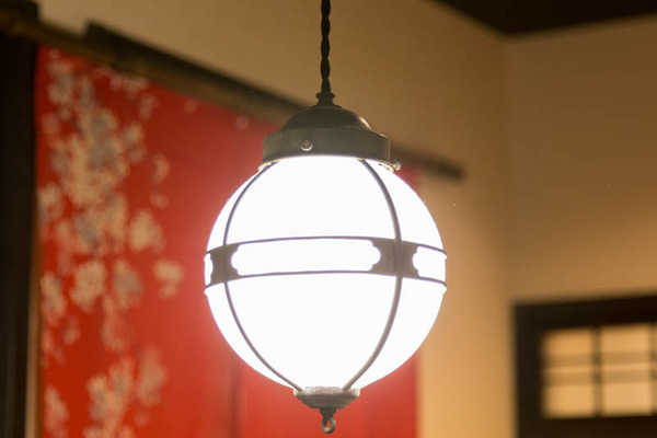 他にも、古家具や古建具をたくさん使っています。この照明は大正時代のものです。