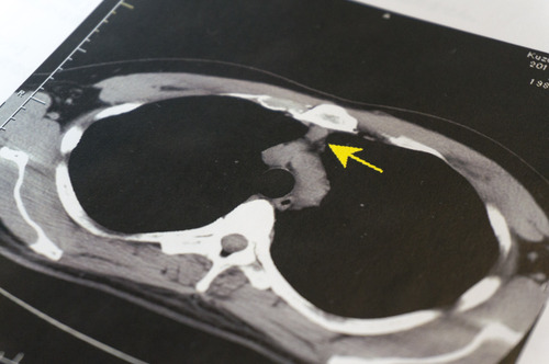 「そう!自覚症状がなくてもCT検査によって異常が見つかることは珍しくないのよ。こちらはカズマ@ひらつーの心臓の上ぐらいの体の断面の画像。CT検査によって、小さい腫瘍が見つかったわ!黄色い矢印のとこね。」