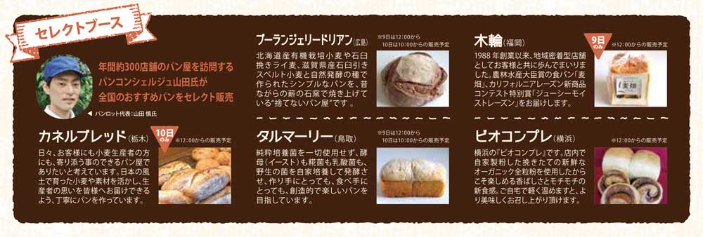 Boulangerie L’oiseau bleu、燻製菓子店、Carte Blanche、レブレッソ&メルカートピッコロ(レブレッソは9日のみ、メルカートピッコロは両日出店)、ぱん工房ラパン、べーぐる屋 自家製酵母ぱんroll、パン屋のグロワール、天然酵母ひねもすぱん