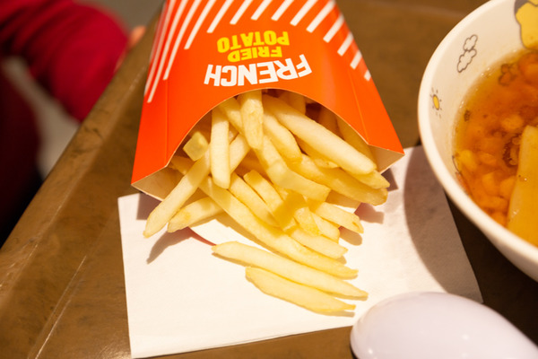 モチコチキン・エビフライ・ポテトフライ・サラダ・スープ・デザート・ドリンク(有機100%オレンジジュース・有機100%アップルジュース・カルピス・ウーロン茶のどれか)