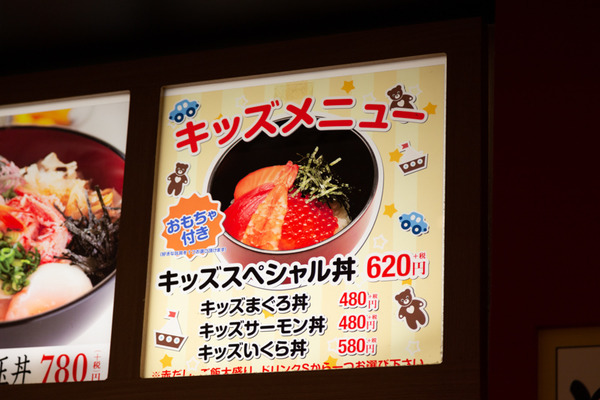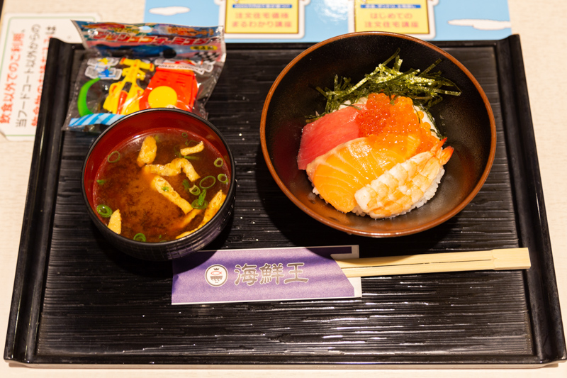 まぐろ・サーモン・エビ・いくらがのった海鮮丼に赤だし・おもちゃがセットになっています。