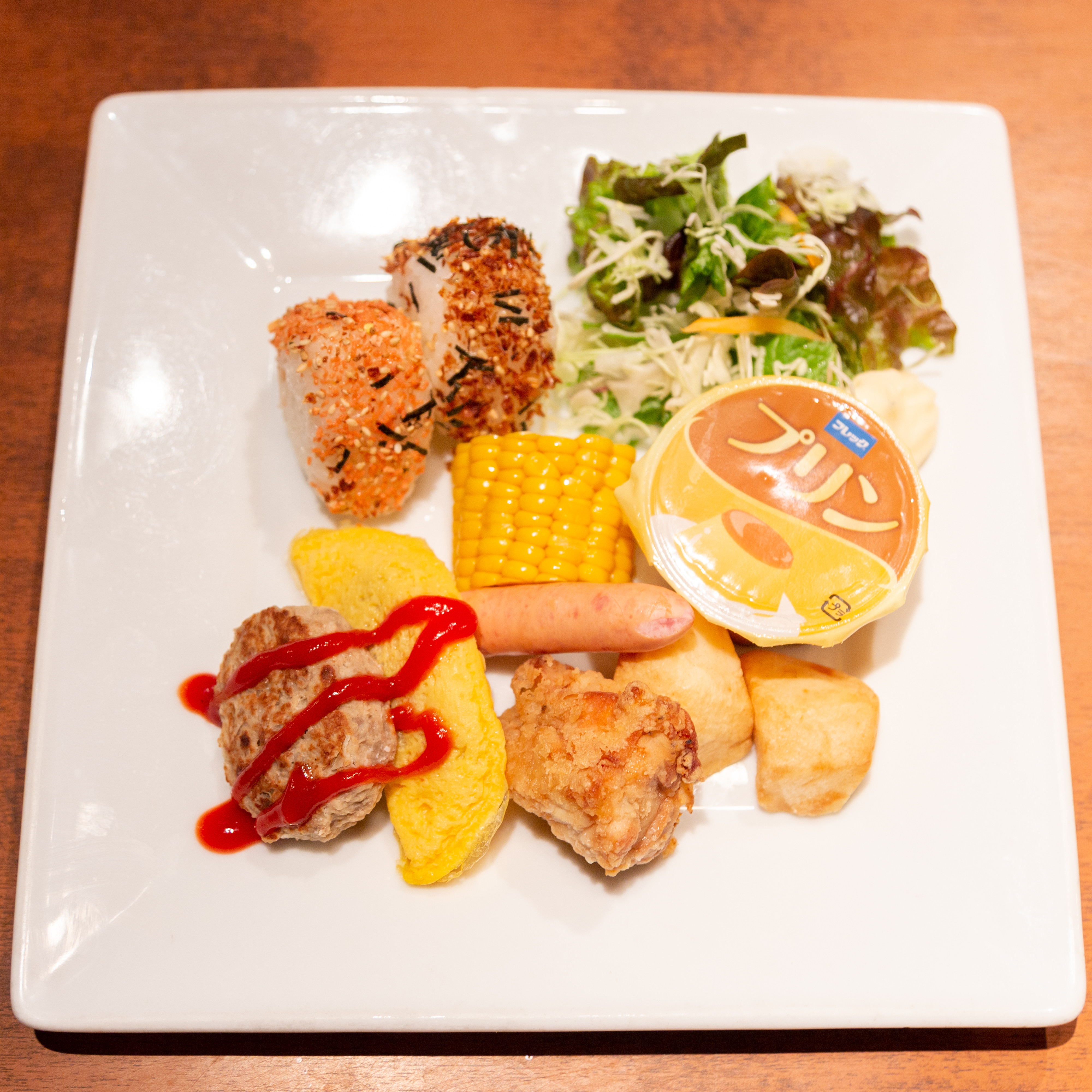 おにぎり・ハンバーグ・オムレツ・から揚げ・ポテト・ソーセージ・コーン・デザート