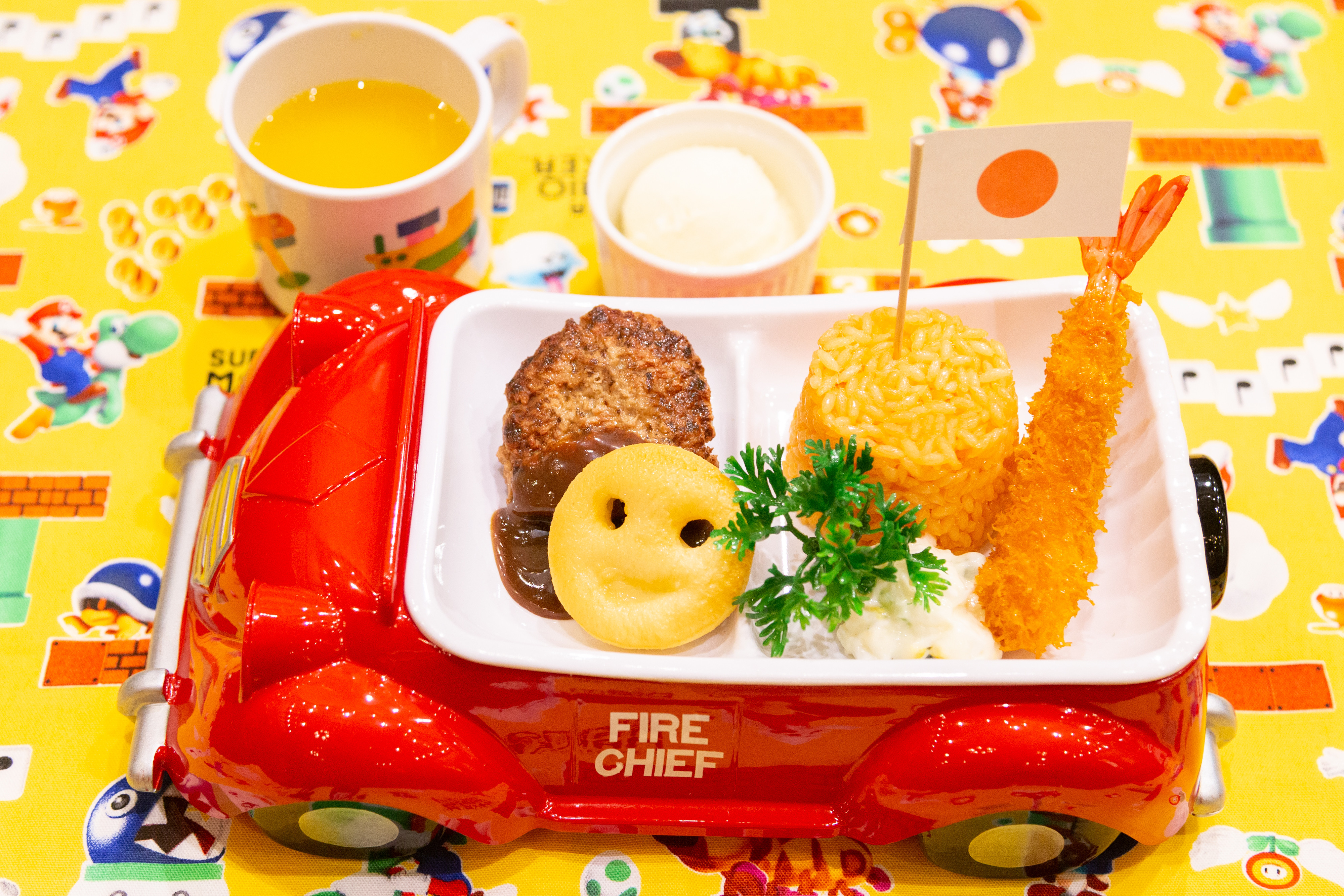 ハンバーグ・エビフライ等のメニューにドリンクとアイス、そしておもちゃが付いています。